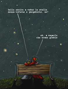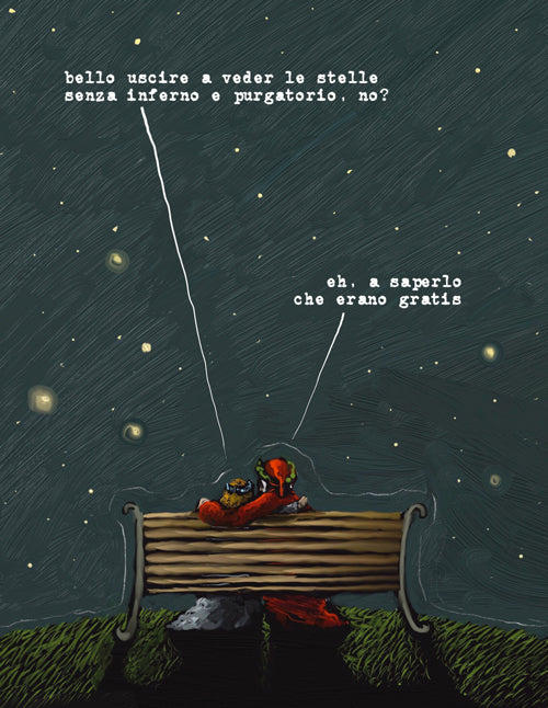 All’ennesimo congresso internazionale dei dentisti dantisti c’è un nuovo invitato: Fabio Magnasciutti. In un crescendo patafisico di sguardi su quella tragica commedia che è la Commedia, Magnasciutti ci porta dritti tra le fiamme del nostro inferno contemporaneo. Lo fa con un segno grafico così chirurgico e insieme evocativo, che, anche a prescindere dalle sue battute fulminanti, basterebbe guardare le figure per scompisciarsi dal ridere. Un inferno di risate.